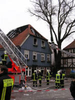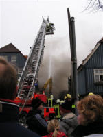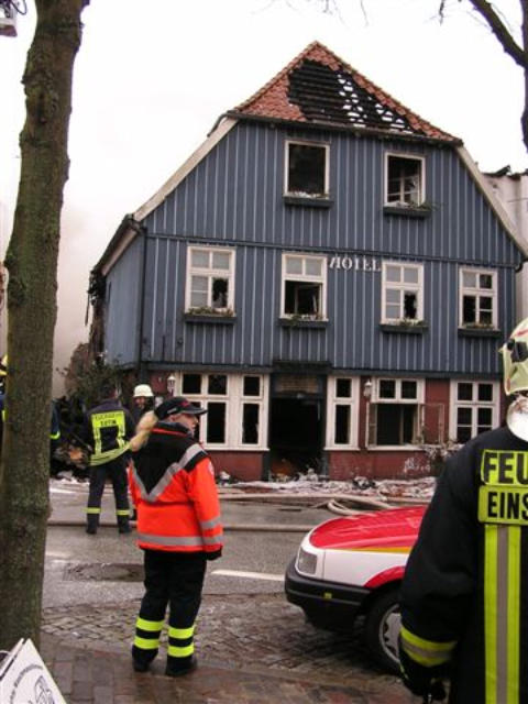 30. Januar 2006, am Mittag: Noch stehen die Außenmauern, hinter denen sich aber noch Brandnester verbergen. Die Fassade muss eingerissen werden.